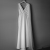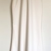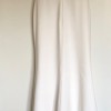 The top is a bodice underneath with a gathered 'v' neck sleeveless style that sits wide on the shoulders. The skirt is double-layered, fitted to the knee where it flares out into a small train. The fabric is a jersey crepe with a little give in it making it very comfortable and stylish.