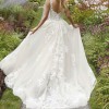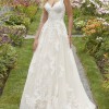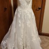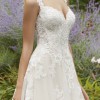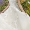 A gorgeous Frosted, Alençon Lace and Medallion Style Appliqués on a Soft Tulle Ballgown. The gown features Appliquéd Straps that transition to a beautiful sweetheart neckline. The gown is finished with a pretty chapel length train.
