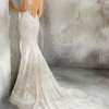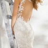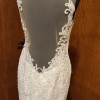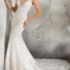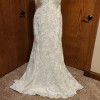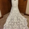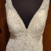 This stunning V-Neck Fit and Flare Wedding Dress with Embroidered Appliqués and Beading on Chantilly Lace with Sheer, Scalloped Train. A Plunging Illusion Back Completes the Look. The gown is finished with a pretty chapel length train.
