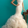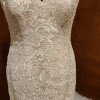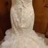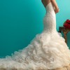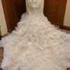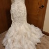 Strike a statuesque silhouette in this embroidered gown, finished with a wealth of organza ruffles at the hem. A truly Hollywood look with so much detailing at the hemline. The bodice is very pretty with the sweetheart neckline. The train is full of soft layers of organza ruffles. A show stopping gown in the beautiful champagne/ivory color.