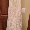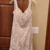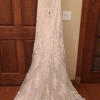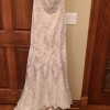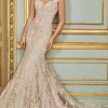 Sleeveless re-embroidered Alençon lace on tulle over soft satin trumpet gown with hand-beaded scalloped lace shoulder straps featuring delicately draped necklace-like beading, beaded sweetheart neckline, low scooped illusion lace back bodice with crystal beading. The gown is featured in the pretty ivory/sable color.