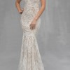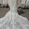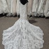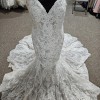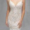 Floral motifs and dimensional leaves cover this Gorgeous fitted gown. Allure Couture has spared no design elements in the design of this fabulous gown. The bodice is so attractive on any bride and features a thin spaghetti strap transitioning to the back bodice. The back bodice features a low zippered back with buttons. The gown is finished with a stunning chapel length train. This gown is the popular nude/champagne/ivory color.