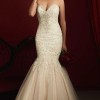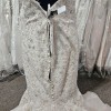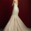 This gown is for the Couture bride that loves intense beading and delicate lace. This strapless, sweetheart necklined gown is perfect as the bride stuns the crowd walking down the aisle. The back of the gown is finished in the trademark Allure button treatment from the top of the zipper to the end of the chapel length train.