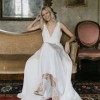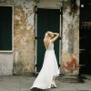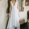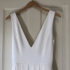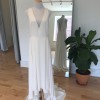 It has a beautiful V front and a flattering deep V back. The style has a high-low hem that could be altered to tea-length if desired, and as-is perfect for showing off a beautiful statement shoe! The underlayer is sheer silk that peeks out the hem of the dress so it has a lovely petal-like effect. The high-quality silk crepe fabric has a substantial and luxurious feel to it. Also, it has pockets! But you would never know by looking at it as the fabric drapes perfectly. Would make a lovely gown for any ceremony or sophisticated elopement.