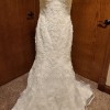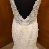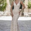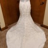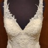 This full- length beaded applique gown with sparkle sequence underlay. The v-neckline has pretty straps. The gown is finished with a court- yard train with zipper back.