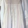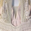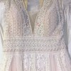 Mesmerizing soft and flowing, this stunning wedding gown features intricately hand beaded floral and geometric lace panels layered over spotted soft tulle. An ornate pattern of vertical lines gives this dreamy gown a figure flattering silhouette. The open back is fastened at the neck with pearl buttons and flows to a slight V shaped waistline at the back.