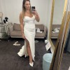 The Chanel gown is quickly becoming a favourite of the 2024 Miss Chloe collection. A cat-eye style bodice with rouching over the bust and hips creates dramatic curves, while the cocktail split allows ease of movement. The feature illusion-mesh back with exposed corsetry is fastened with covered buttons.