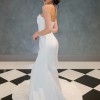 Italian silk crepe gown, trumpet skirt, Chapel train, Center back decorative button details. The bow was added by the designer.