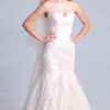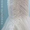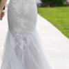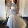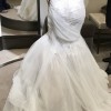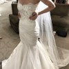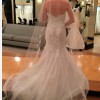 NEVER worn. NEVER Altered. Silk white,“latte” underlay. Matching veil included. Elegant mermaid gown with delicate and beautiful lace details. The elongated mesh lace sweetheart bodice ends where the skirt with appliques begins; fitted to the thigh where the tulle starts (the beading, sequin and lace detail continue on pieces of the tulle) Gorgeous! Extremely comfortable to wear and allows for easy movement. Skirt allows for a bustle if desired.