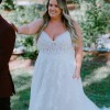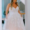 This graceful A-line wedding dress is designed with a bikini neckline that's accented with tonal beaded spaghetti straps. Sequined lace appliqués sparkle as they adorn the sheer bodice, subtly concealing the exposed boning and feminine demi cups. Lace appliqués continue down the lightweight tulle skirt, forming a classic outline around the train. This style is also available with the bodice lined to the side seams if preferred.