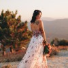 I know everyone says that their wedding dress is special but this one truly is!! Madi Lane “Season” is the perfect blending of traditional and unusual in one wedding dress. The rich red, deep plum, soft blue and lavender, and dainty cream flowers and dark green leaves over the white gown are placed perfectly along the bodice and hem and scattered throughout the rest of the dress. There is a subtle shimmer from sequins in the center of flowers. The colors are a perfect palette to inspire decor for a summer or fall wedding. It has a gorgeous dramatic train that bustles neatly and securely for end of the night festivities. The strapless top does not slip down or need to be constantly adjusted. It has 6 layers that work together to create the right amount of volume and drama while still looking sleek and allowing movement. It was so comfortable to wear all night long that I didn’t want to get out of it!