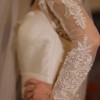 The elegant curve neckline and high back offered a sophisticated blend of classic and modern style that left everyone in awe. Long sleeves in luxurious satin provided just the right amount of coverage while still feeling light and airy. The ivory color radiates purity and elegance, making it a timeless choice for any bride.