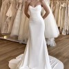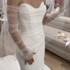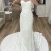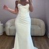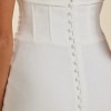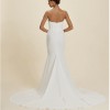 Features a structured strapless cat-eye neckline with semi-exposed boning and a flattering fit-and-flare silhouette. Made from luxe ivory crepe, it offers a clean, sculpted look with a soft train.