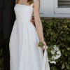 The Esther Strap Gown in ivory effortlessly radiates elegance and sophistication. Tailored from brocade, it features a square neckline and fitted bodice, cinched at the waist accentuating the figure. The circular skirt enhances the graceful silhouette, complete with a crinoline hem and side seam pockets. it's a gorgeous dress that I had a great day in. It's been expertly dry cleaned and is spotless. The bodice is fitted but the back sits just high enough to be able to wear a strapless bra under the dress is you'd like to. Really beautiful textured brocade ivory fabric.