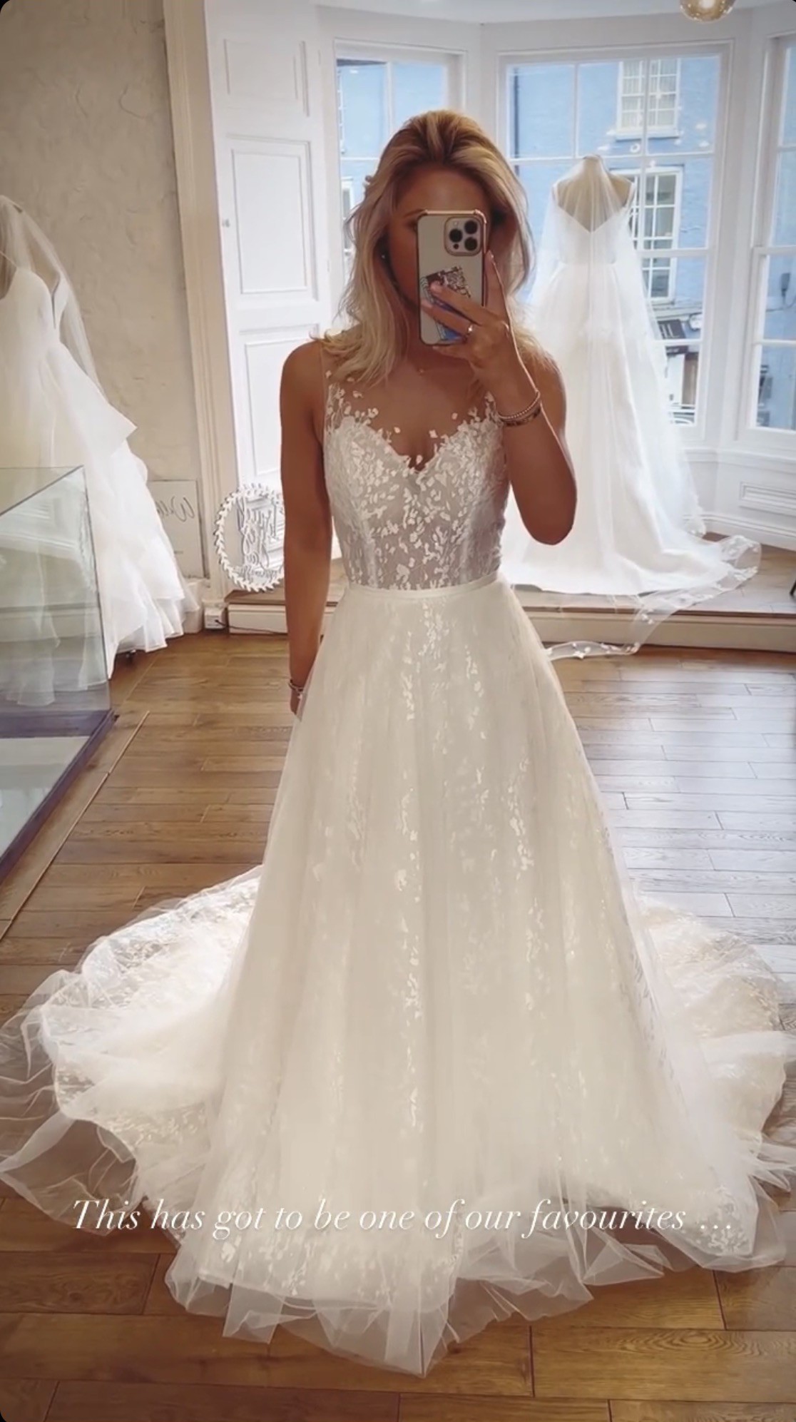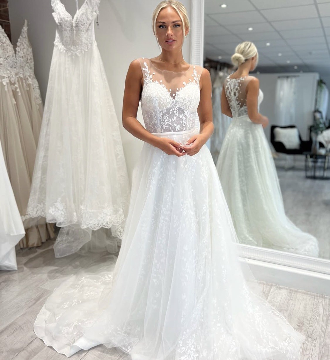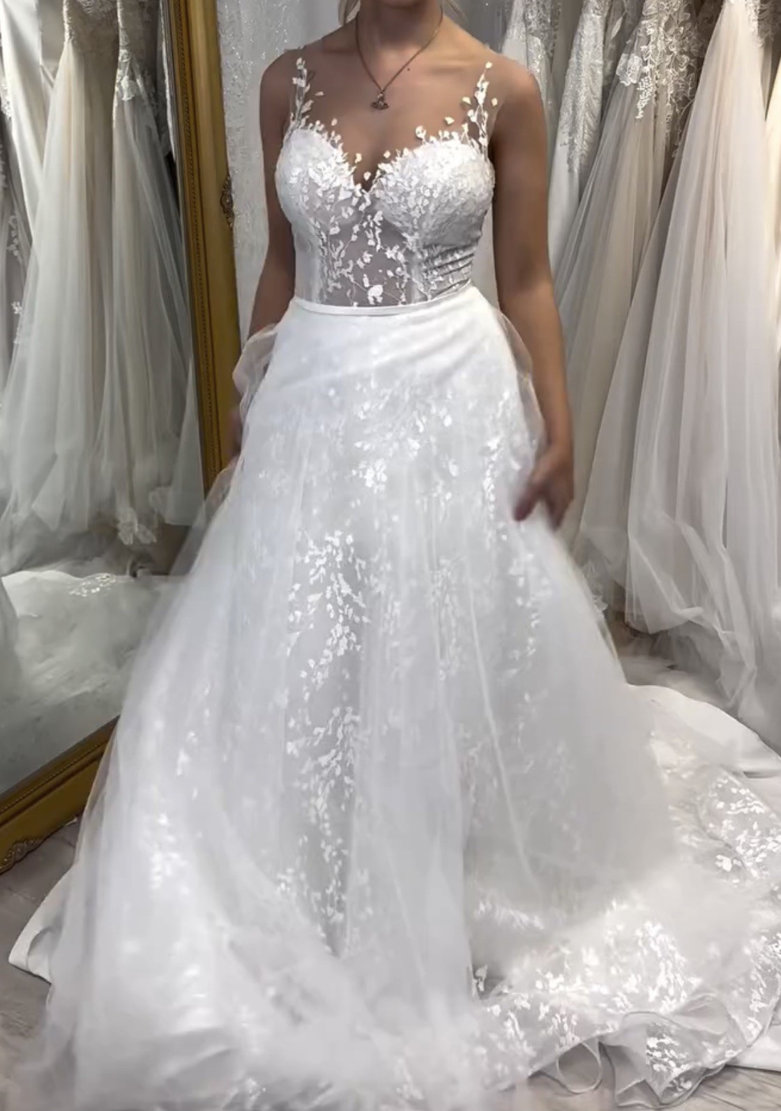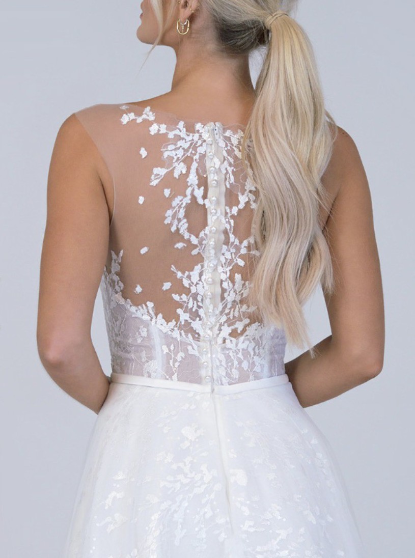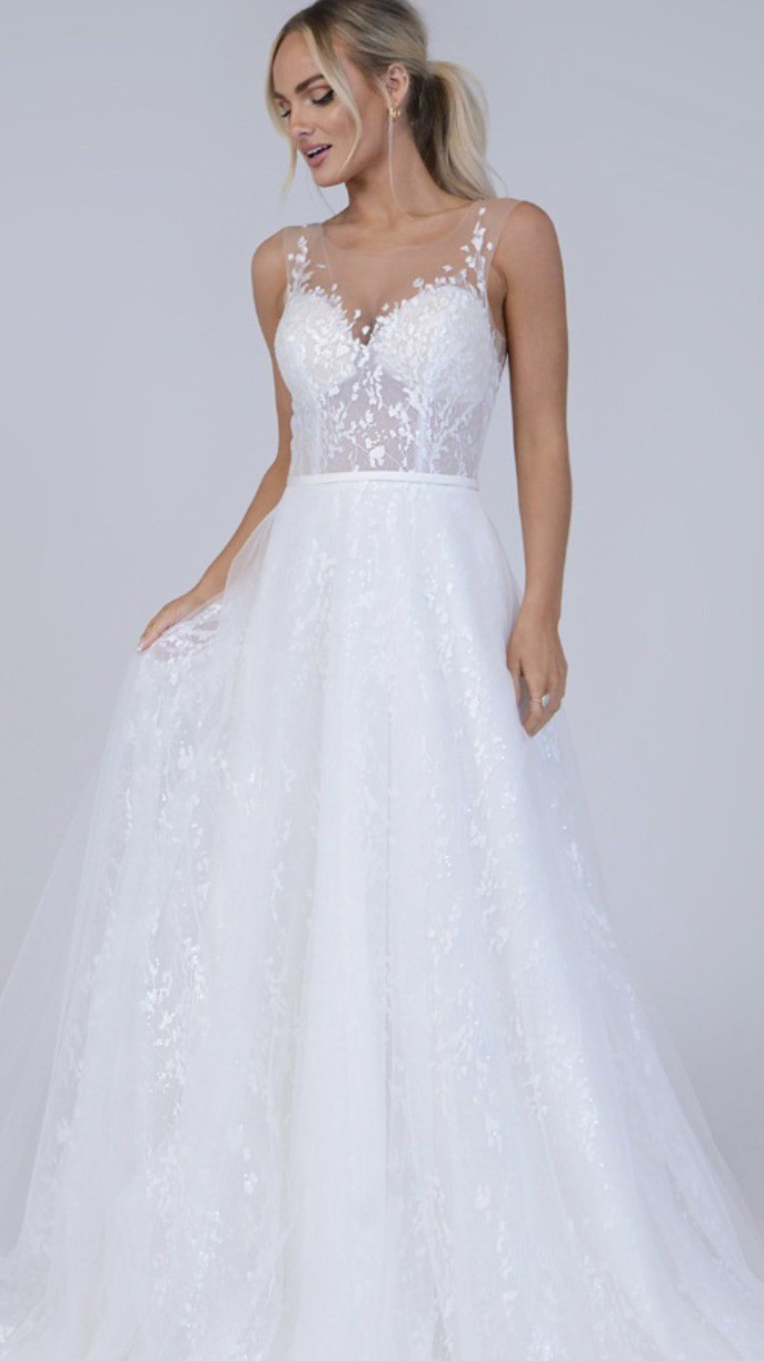 Isla is an A-line gown in soft tulle and lace with an illusion bodice and a lace illusion back. This is an ex-sample in great condition with no alterations.