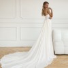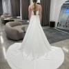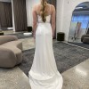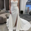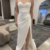 This is a new Store sample with tags - Mikassa is a sophisticated and effortless satin wedding gown with a sweetheart neckline embellished with crossover draping and sparkling crystals of the straps and waistline. The gown features a thigh high crossover split, trumpet skirt and chapel train. Sculptural pleats accentuate the bust and hips spilling out into a dramatic satin overskirt with a cathedral train