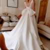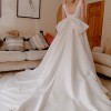 Beautiful dress worn at Wedding in August 2024. Includes beautiful buttoning down length of back of dress and Justin Alexander Signature large bow which is detachable with poppers to attach to dress and train. Also includes beautiful Italian Tulle veil. Fabulous train that can be hooked up for reception. It has been professionally cleaned and is in perfect condition.