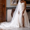 Stunning Gigi Milla Nova dress, with Olympia overskirt. Satin fitted wedding dress, with a statement leg split. You can wear with the overskirt for your wedding ceremony and remove the overskirt for your reception (2-in-1 dress)!