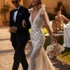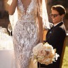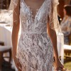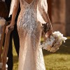 Semi-transparent beaded sheath gown with a plunging V-neckline, an open back, and tulle bow‑straps. This dress also comes with a beautiful veil and skirt slip.