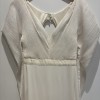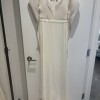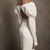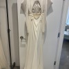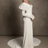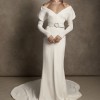 Description from the designer: Off-shoulder gown with mini-pleated Georgette draped sleeves, and Grosgrain waist detail. Smooth faced Cady skirt, with circular train.