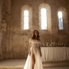 Indulge in sheer opulence with this exquisite A-line lace wedding dress. Every inch of this gown is adorned with intricate beadwork and shimmering pearls, creating a mesmerizing display of luxury. The off-shoulder neckline exudes femininity and allure, while the long sleeves add an elegant touch of sophistication. To add a hint of allure, a high slit on the leg reveals just the right amount of skin, allowing you to make a grand entrance with every step. This dress is a true masterpiece, meticulously crafted to make you feel like a radiant bride on your special day. Prepare to captivate hearts and create unforgettable memories in this stunning wedding gown. Detachable Bolero included in listing price.