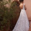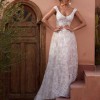 V-neck, lace, A-line wedding gown with cap sleeves and low scoop back.
