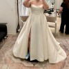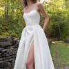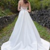 The Mollie gown adds thoughtful details to a classic silhouette. Featuring a beautifully structured bodice with a sultry scoop neckline with high peaks, the full A line skirt is elevated by inverted box pleats and a dramatic side slit. The sheer illusion back with exposed boning ensures a beautiful view from any angle, and covered buttons to the hem add one last classic bridal detail.