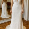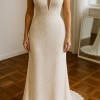 This gown blends Rosa Clará’s classic touch with a modern, timeless design. Its subtle train and flattering cut enhance the silhouette, striking the ideal balance between comfort and glamour.