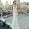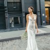 The Marnie V-neck satin bridal gown brings old Hollywood glamour into the 21st century in an effortlessly chic way. The V neck tapers up to a delicate spaghetti strap to highlight your shoulders and collarbone. The low scoop back has a barely there feeling, and the bias cut skirt slinks over every curve. The back flounce seam gives way to a dramatic court length train.