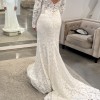 Allover cotton lace gown with v-neckline, illusion bodice, and long sleeves.