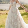 Avery is the epitome of natural grace and relaxed elegance. This wedding dress features a stunning A-line silhouette, allowing the skirt to billow gracefully as you walk, evoking the movement of nature’s elements. The gown is adorned with large floral lace appliqués, flowing organically across the fabric and creating a sense of softness and femininity. The thin spaghetti straps add a delicate, casual feel to the gown, perfectly balancing the romance of the lace with the carefree ease of its design. The combination of the flowing lace and ease of the design makes Avery a perfect choice for the bride seeking both natural beauty and effortless elegance.