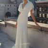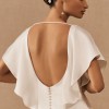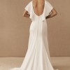 Expertly draped satin lends this gown its graceful silhouette, topped off with a V-neckline and romantic flutter sleeves, which cascade over the shoulders to frame the low scoop back. A row of dainty buttons and a flowing train ensure an exit as grand as your entrance.