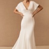 The Beale V-neck fit and flare flutter sleeve satin wedding dress is an unexpected combination of sleek yet ethereal elements. The sultry V neckline and low scoop back are balanced beautifully by the airy and romantic flutter sleeves. The gown follows your silhouette hugging every curve and releasing into a flared skirt with fluid movement and a dramatic court length train. Covered buttons down to them add a classic bridal element.