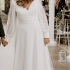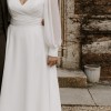 The lightweight chiffon fabric makes it a dream to wear, flowing effortlessly as you glide down the aisle and twirl on the dance floor. The V-back offers a touch of intrigue, drawing everyone’s eyes to the beautiful silhouette. Size 20, it suits curvier brides perfectly, ensuring comfort and grace throughout your special day.