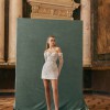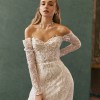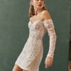 A captivating lace mini wedding dress that exudes elegance and charm. This figure-hugging silhouette beautifully showcases the body, while the intricate lace detailing adds a touch of romance. The long sleeves create a sophisticated balance, making it perfect for a bold yet refined bridal look. Every inch of this dress is adorned with delicate embellishments, emphasizing its luxurious craftsmanship. A modern choice for brides who want to make a statement with style and grace. Perfect condition.