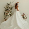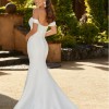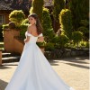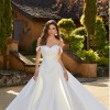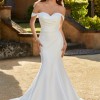 Sophia Tolli Y12237 fit and flare wedding dress is designed in stretch Mikado, featuring a draped sweetheart bodice with off-the-shoulder straps. A slim waistband accents this two piece bridal gown, finished with covered buttons from the mid-rise back to the chapel train. There is a removable pleated overskirt has matching buttons down the back that turns into an A-line silhouette when attached.