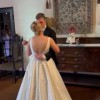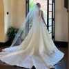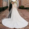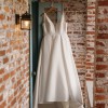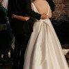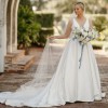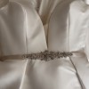 Elegant and timeless Pronovias Malena princess silhouette in Mikado silk, with v-neck. With its classic lines and elegance, this beautiful dress will never look dated or trendy. Can be worn with or without the included removable crystal beaded embellishment on satin ribbon, or customize with your detail - you can tailor it to be exactly what you dream and alter to fit you perfectly. The train drops from the v-back; silk buttons conceal the zipper. Discrete pockets in the skirt hold your handkerchief or lipstick for touchups. Minor alterations were done to take up the straps, small hem in front, added bra cups (no need for bra), and added 13 point hidden bustle so you can dance the night away (dress is bustled in video)! I am 5 ft 10 inches so I did not need the dress hemmed much. This dress was so comfortable, and I felt so beautiful and received compliments all night. The dress has been dry cleaned and is immaculate - no stains or tears. 13 ft long veil comb included.