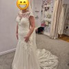 Label states size 12 but could fit a small 14. I am a size 10/12 and planned to have it altered. It is beautifully sparkly and the lace is delicate and so pretty. It has a long train.