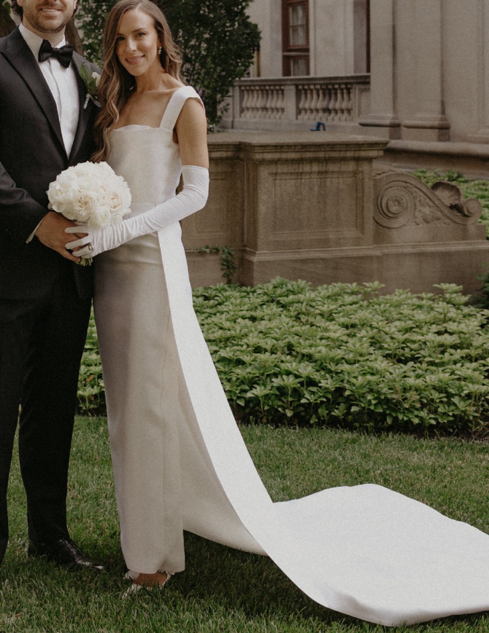 Worn for 3 hrs before changing into next look!! This dress was an absolute dream! Exclusive: DeMaris Bailey/Over the moon collab Bridal Gown with Detachable Train is cut from soft silk mikado and boasts a timeless silhouette designed to capture the elegance of summer’s most idyllic occasions.