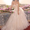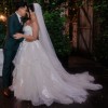 The Maggie Sottero Indiana dress is a princess-inspired, floral, ruffled ballgown bridal dress with a romantic sheer lace train. It features sequin lace motifs over sparkle tulle, a sheer organza-lined bodice with a deep illusion V-neckline, and a sheer lace back with covered buttons over a zipper. The skirt is made of ruffled tulle with a horsehair hem, and the gown includes a sheer lace train. It's designed to make the bride feel like a princess on her wedding day.
