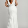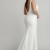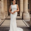 Adele’s silhouette is a sophisticated one, with a refined high neck bodice that skims the collarbones and gives way to a low scoop back. At the back, delicate buttons run the length of the modern mermaid skirt and 65" train. For a little more drama, brides can add sleeves or an elegant cowl for an accentuated feminine shape. This gown is made with crepe material. Never been worn.