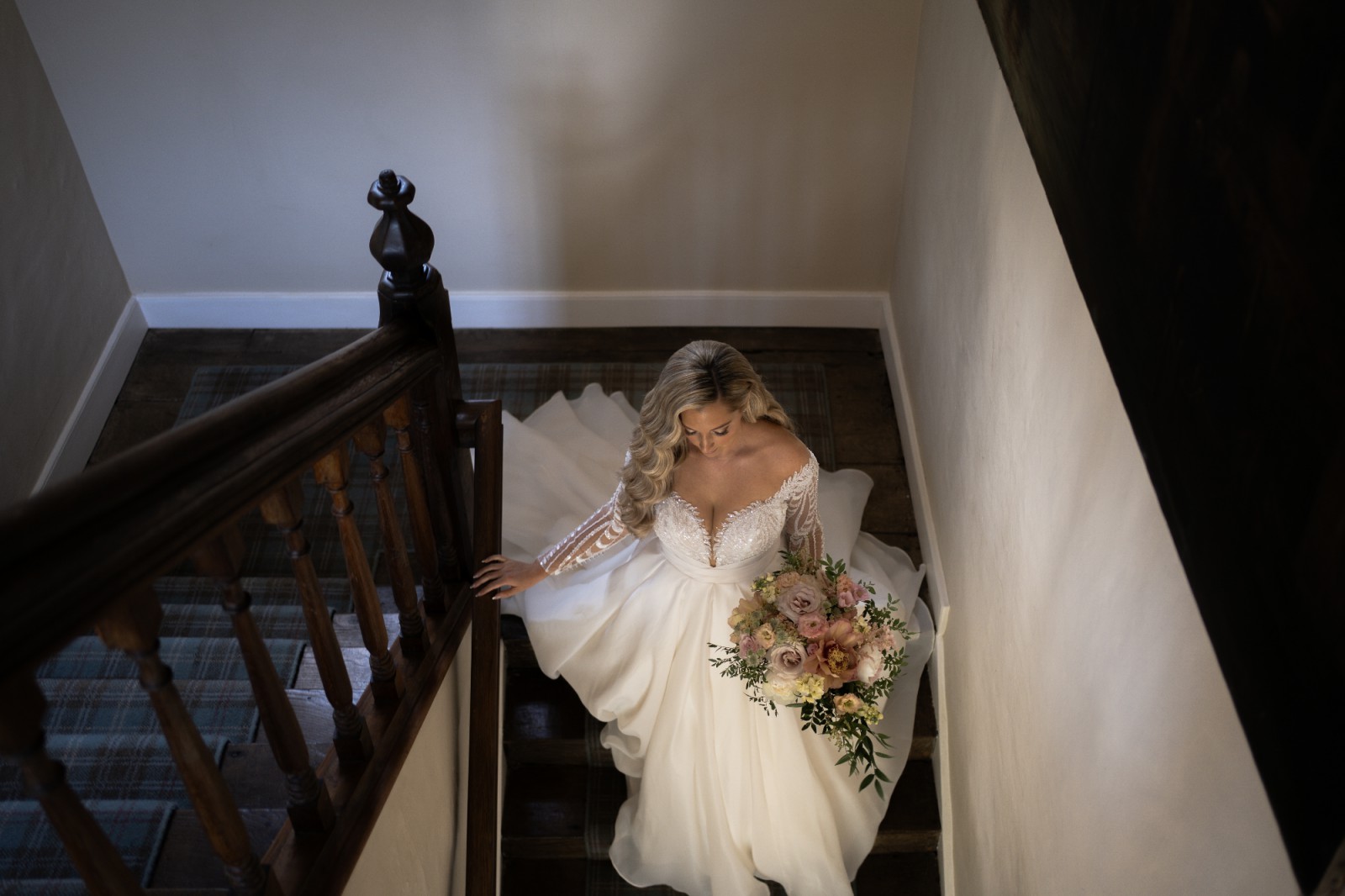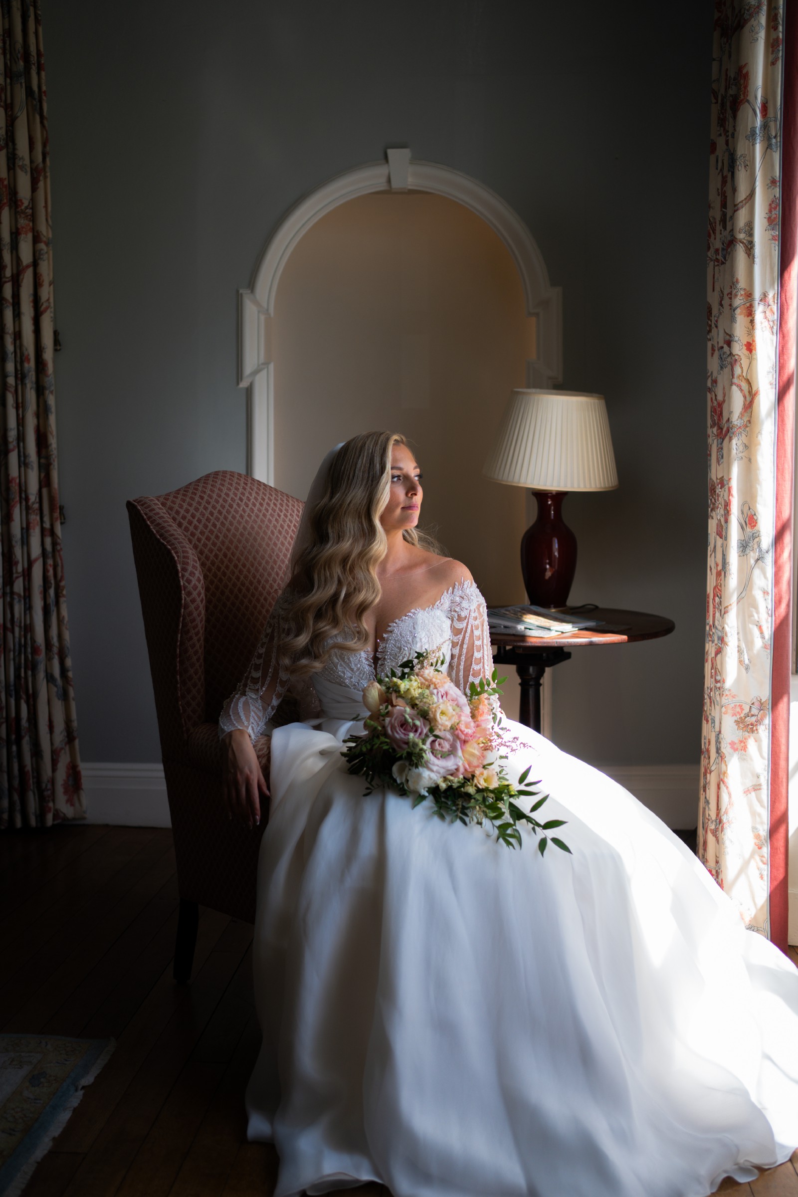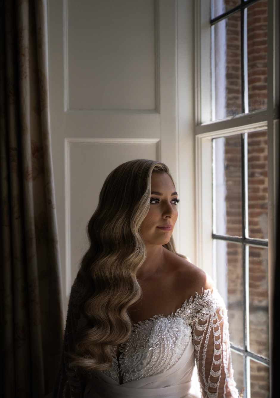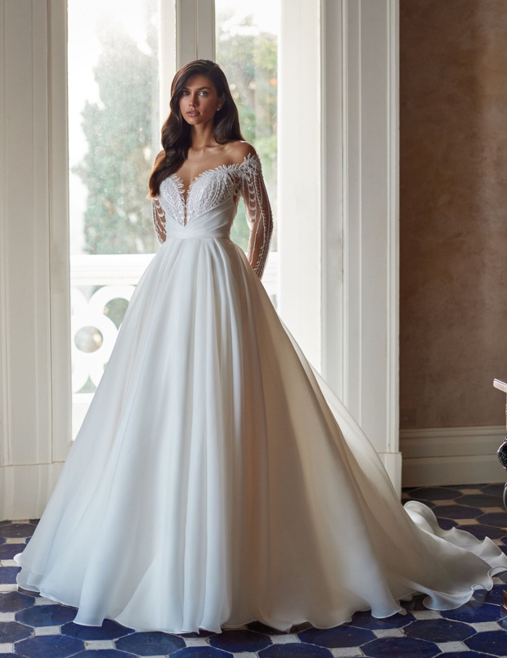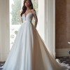 Every bride wants everything to be perfect at her wedding, especially the wedding dress. A fluffy royal dress in ivory color is the perfect choice. The translucent upper part of the corset, with a V-neck and a tank top made of nude mesh, is decorated with embroidered appliqués that smoothly pass to the forearm, covering the sewing line of long lace sleeves. The bottom of the top is draped with asymmetrical organza pleats. The back is decorated with embroidered lace and drapery of textured organza. The clasp of the corset is combined: a mesh tank top fastens with loops and buttons, and the corset with a hidden zipper. The puffy skirt with a train is made of textured organza with pleats along the waistline. The closure of the skirt is a hidden zipper. A wide belt from the main fabric is sewn along the waistline