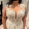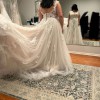 I only wore this dress once, for the pictures. It is a beautiful champagne ivory color. I was a true US size 16 when I bought this dress. I have lost about 50lbs since then, so I unfortunately can't give my exact measurements. As you can see from the photos, hardly a couple of clips to fit it correctly on me. I was so excited because I knew the alterations would be minimal. It is very long. I believe it is technically an A-line but it felt like a bit of a ballroom gown and I had expected to maybe add a crinoline underneath to make it a bit bigger.