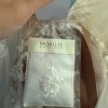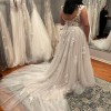 The beautiful bodice features delicate crystal beaded embroidery with a lovely illusion neckline and open scoop back. The double waistband helps to cinch you in, creating an elegant shape, with a long, ethereal, sheer train.