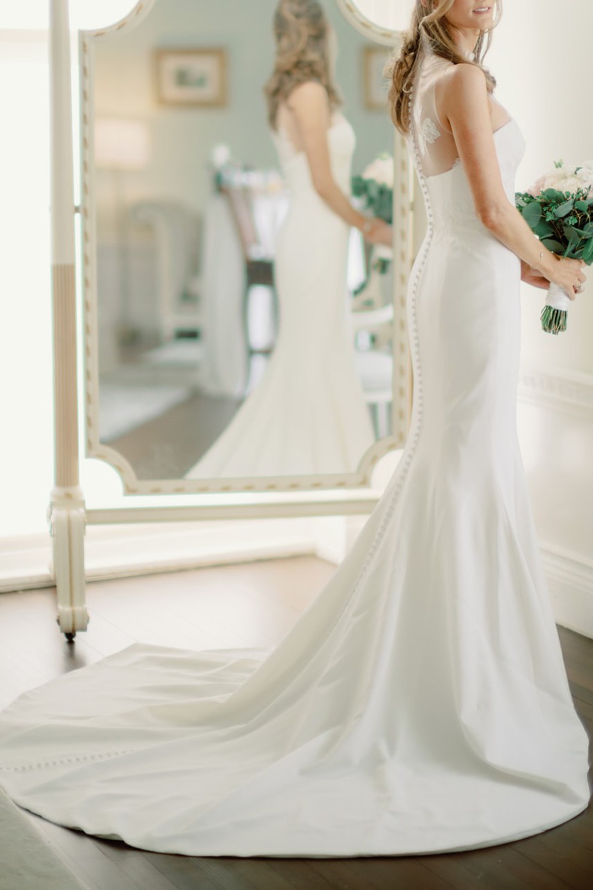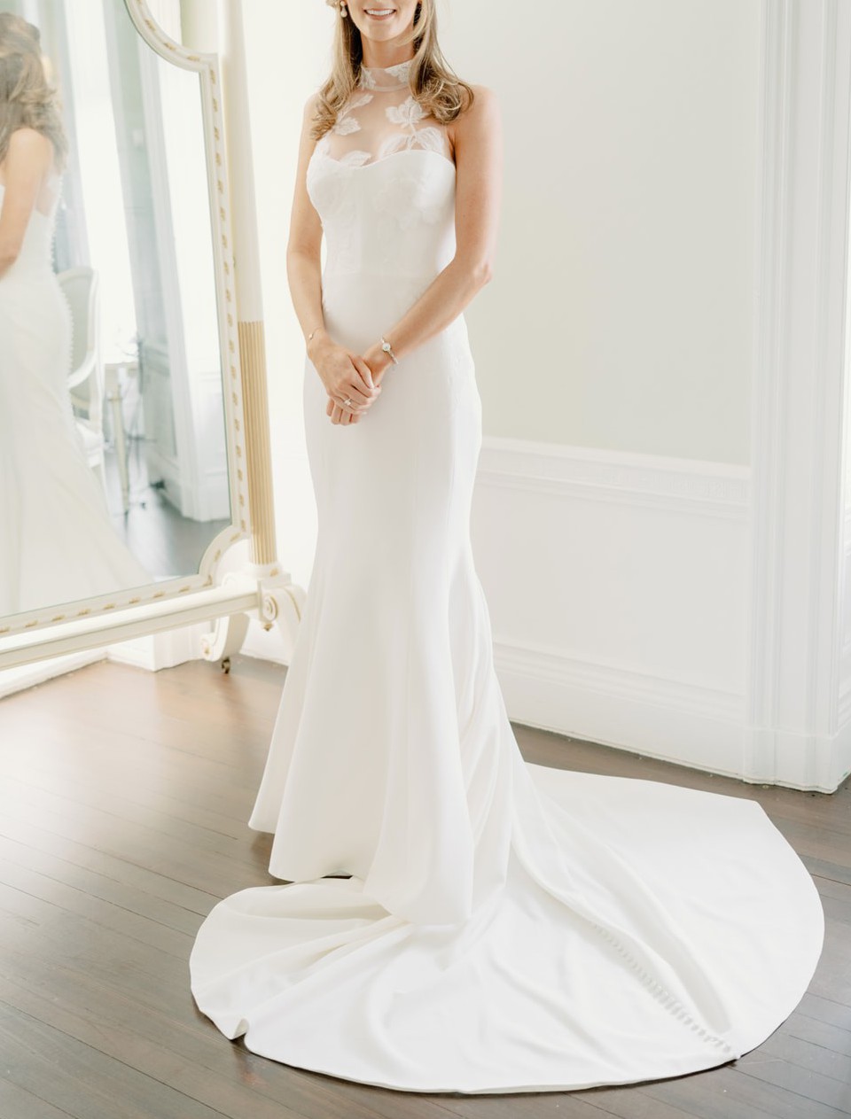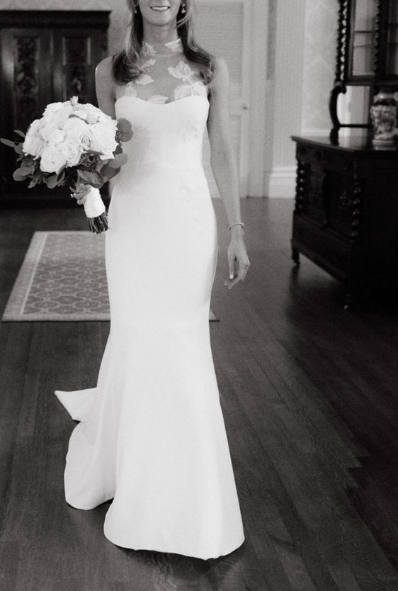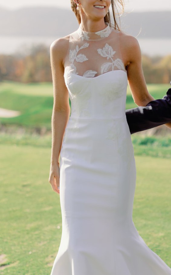 This gown is from Carolina Herrera’s last bridal collection. It features a sheer lace with floral embroidery and button detail down the back of the dress. Fitted around the bust and through the waist. Modest train.