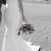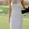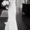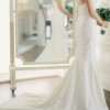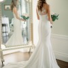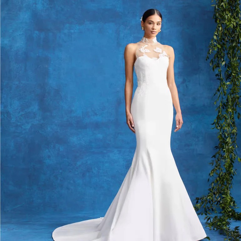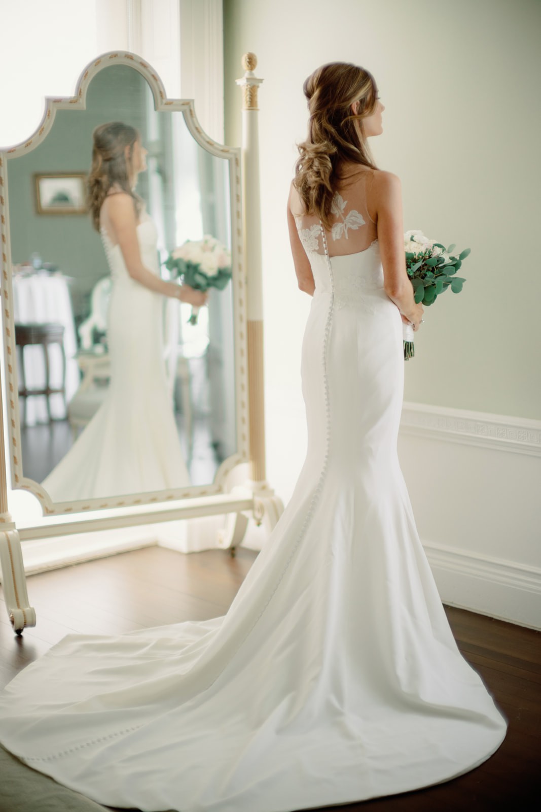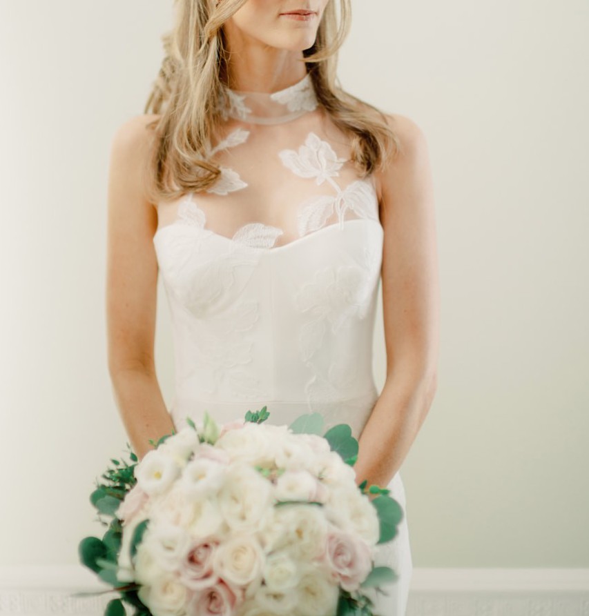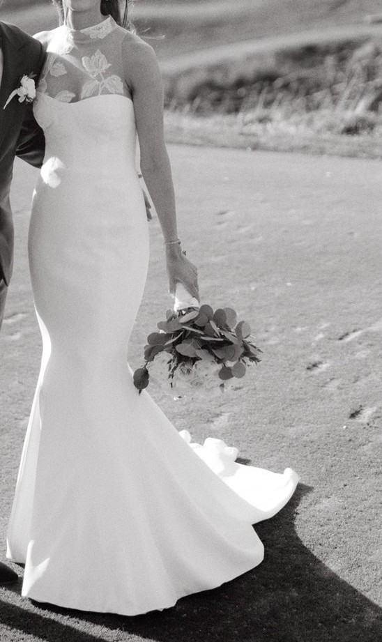 This gown is from Carolina Herrera’s last bridal collection. It features a sheer lace with floral embroidery and button detail down the back of the dress. Fitted around the bust and through the waist. Modest train.