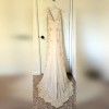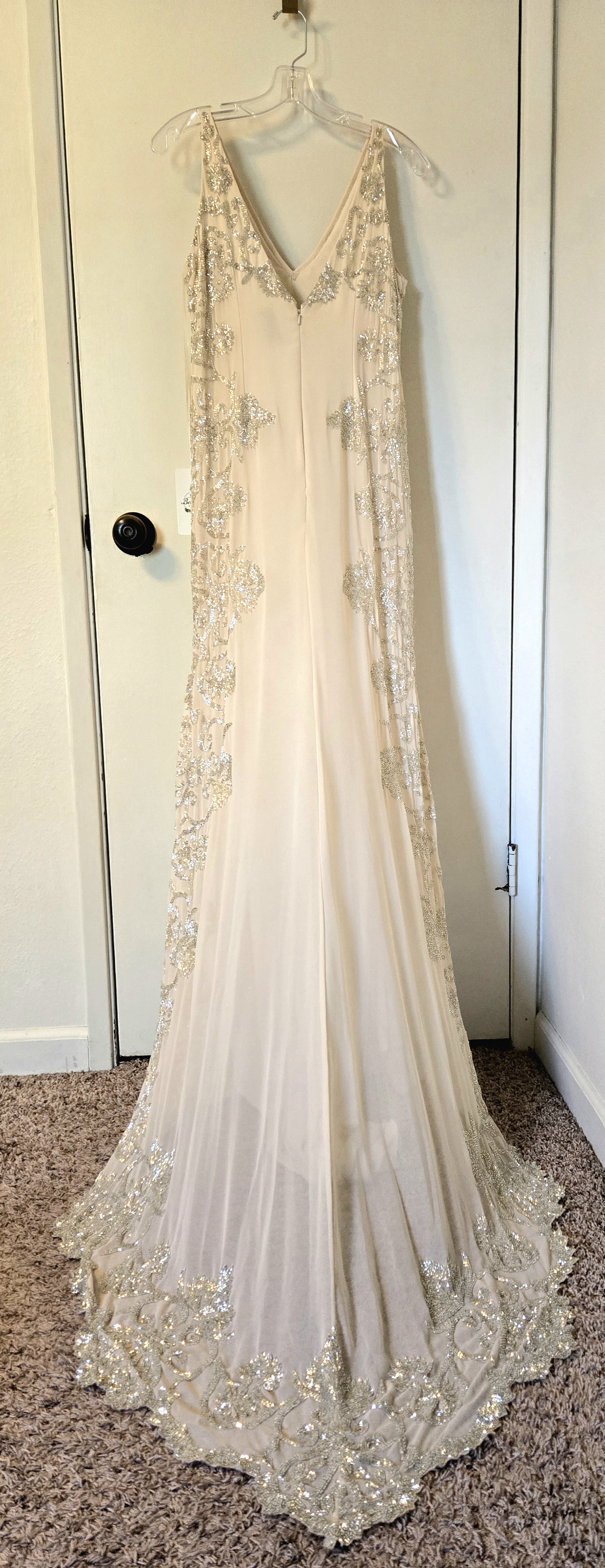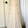 Luxurious beaded wedding gown with train. The silhouette, intricate beading, and cream color give the gown a classic glam that will turn heads. Brand new with tags, never worn outside of trying on. This dress was incredibly long when I first bought it, so I altered it by taking up the straps a little. I am 5'4" and with 2.5" heels, the dress is still just an inch or two too long, but it is close to perfect. This dress was originally $1,500 and beaded veil was originally $300.