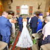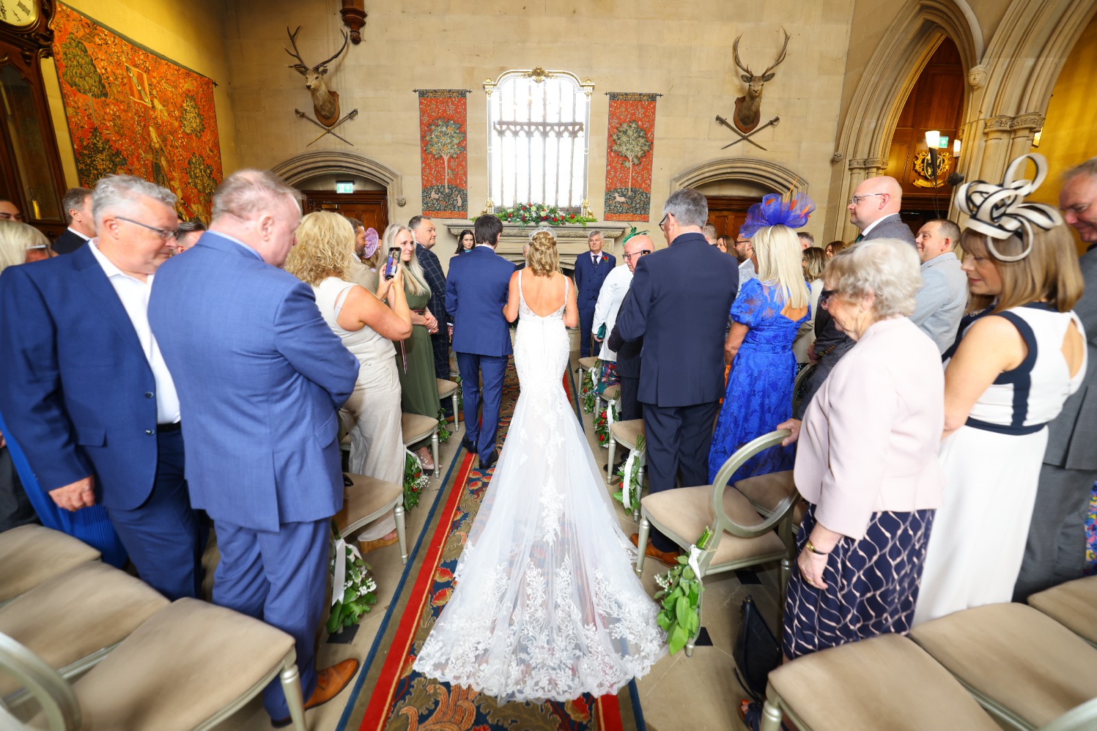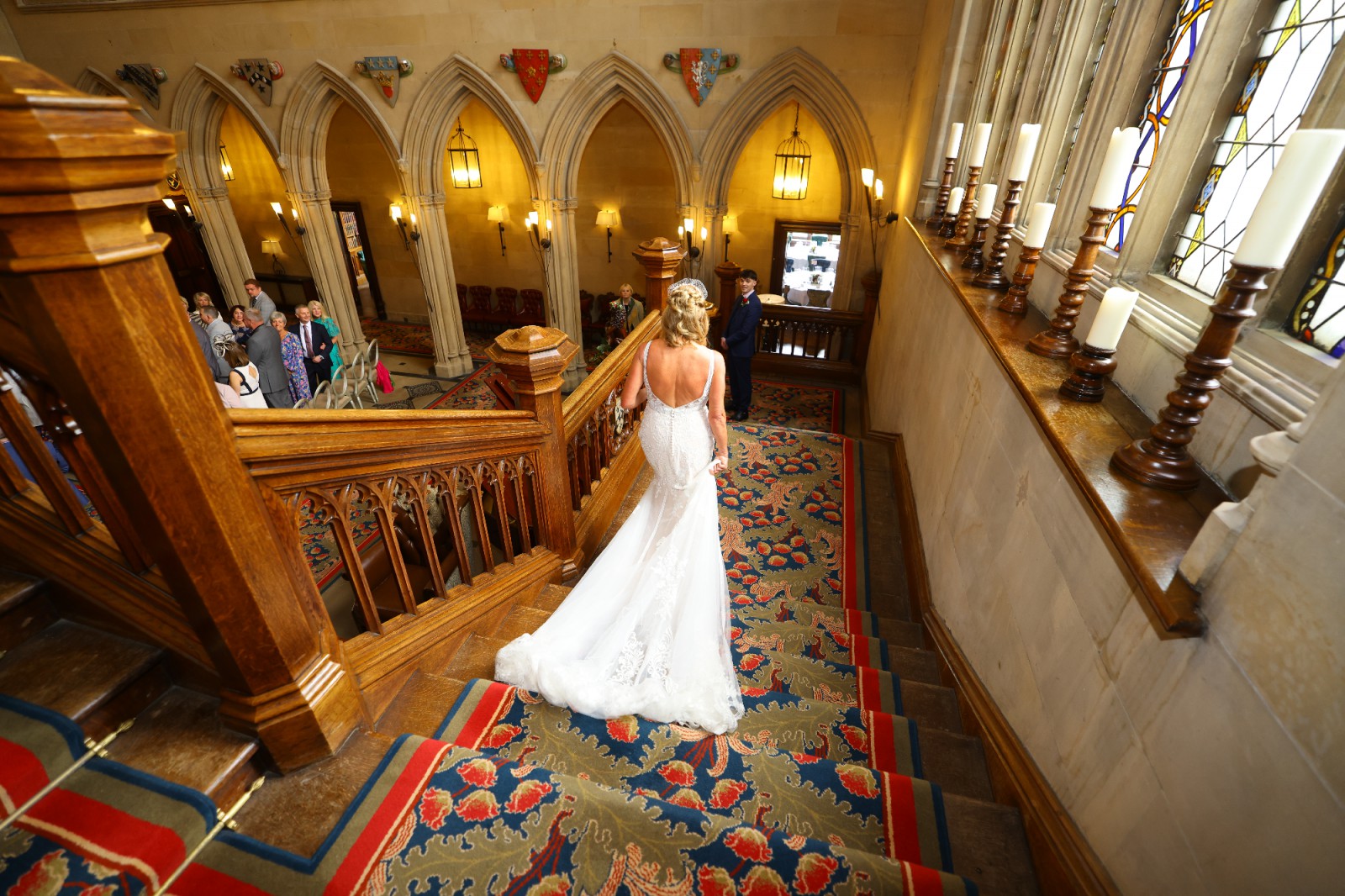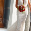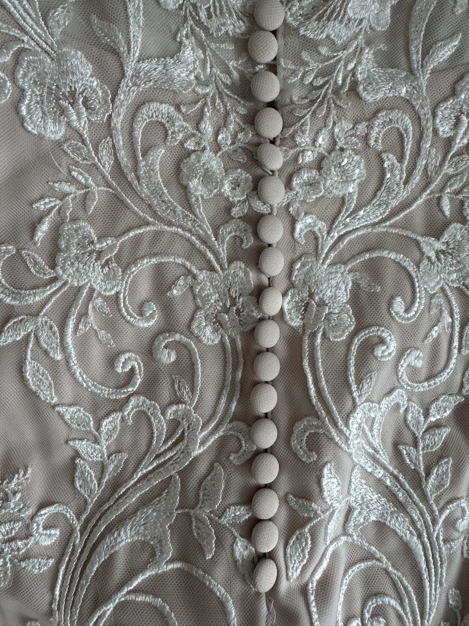 Fastened with a back zip & 17 champagne buttons + a pearl button to enable 2 metre trail to be hooked up