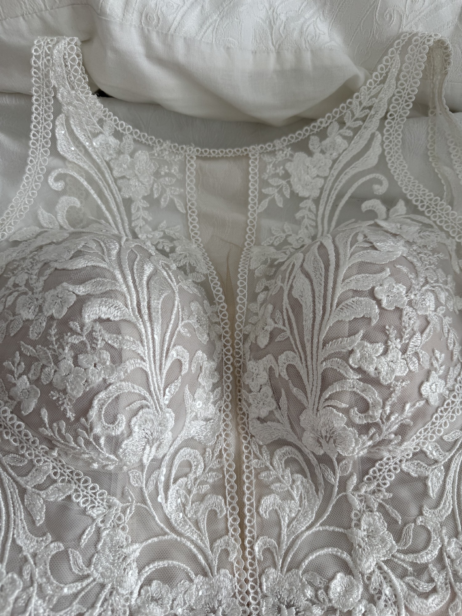 This dress has a beautiful oyster white (champagne) underlay! Lace entwined with sequins for extra sparkle & beautiful 2 metre length laced trail