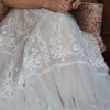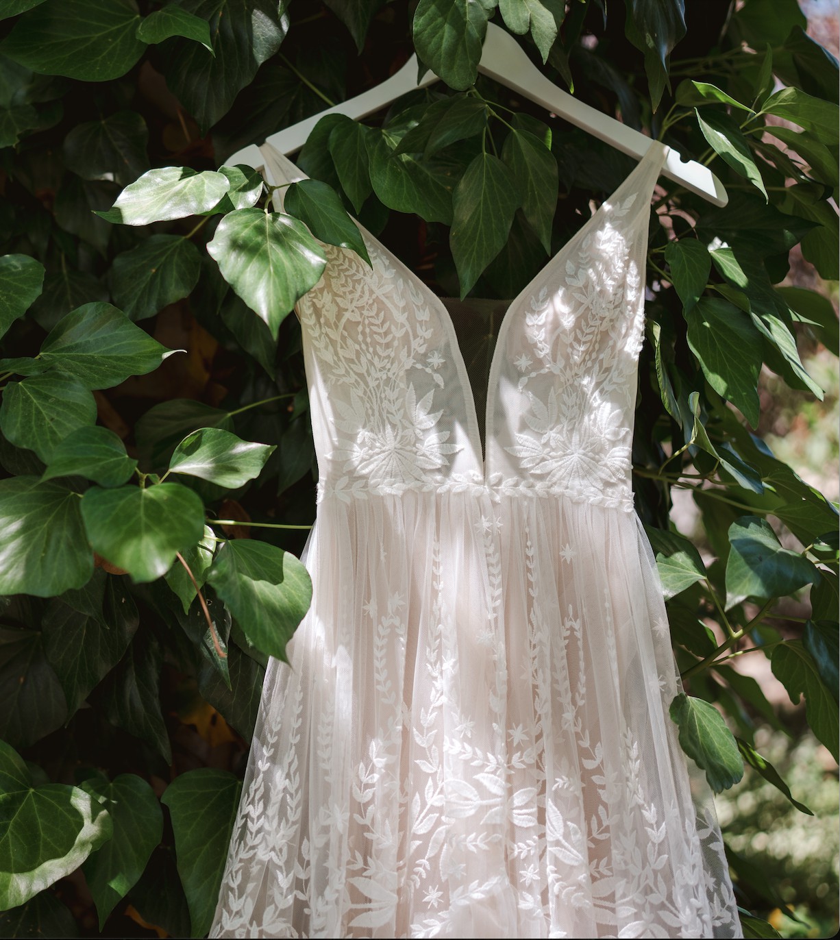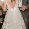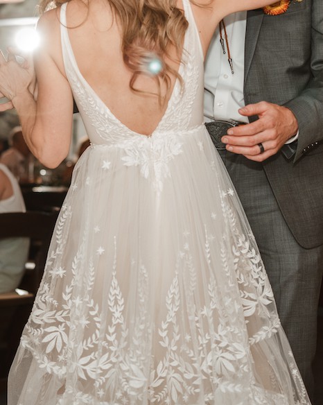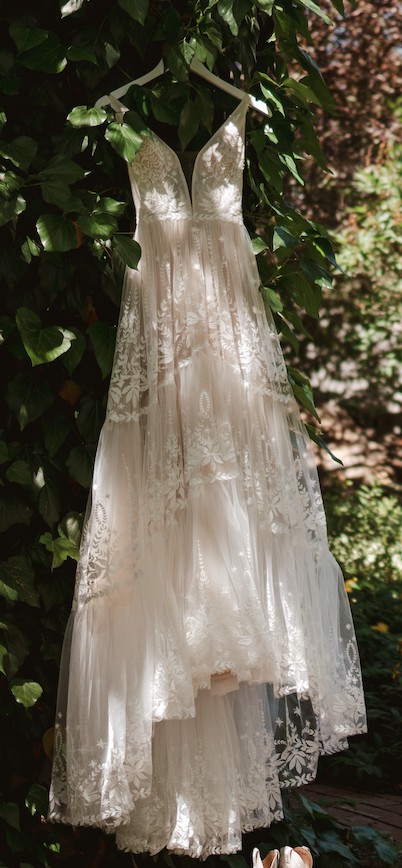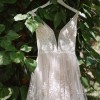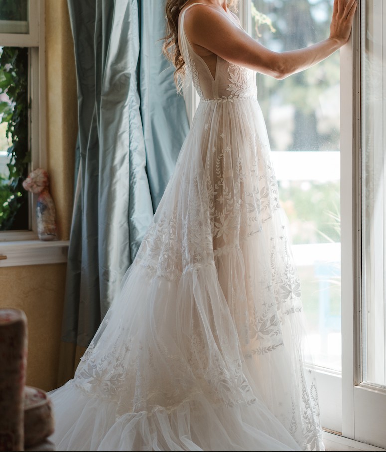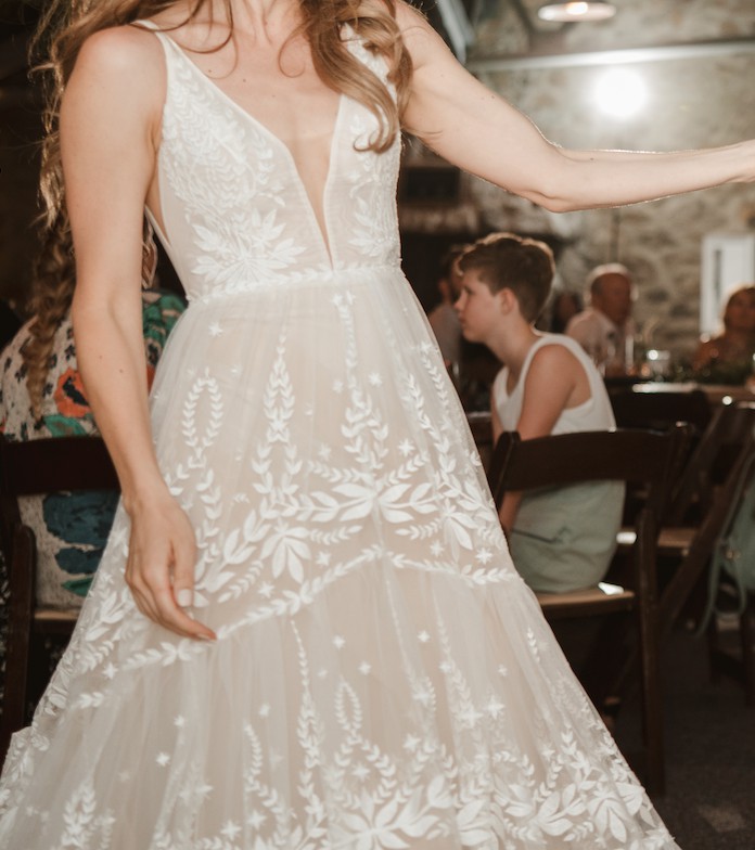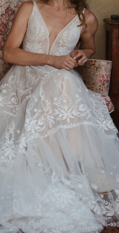 Worn once for my wedding and dry-cleaned afterwards. I was going to keep it because I love it so much but decided to sell. Here is the description from Rish Bridal's website: "Ruby is a romantic boho beauty! This A-line gown features Rish-developed botanical lace embroidered on tulle, a tiered skirt, and a light blush tulle lining. A plunging V-neckline, side cutouts, and a low V-back add a sexy touch to this soft and sweet gown."